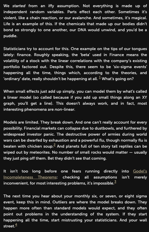 One example: finance Beta in Finance means volatility of a stock with linear correlations with co's portfolio factored out. Despite this, ‘6-sigma events’ often happen, which, according to the theories, and ‘ordinary’ data, really shouldn’t be happening at all. What’s going on?pic.twitter.com/Vs1UFwOlM6