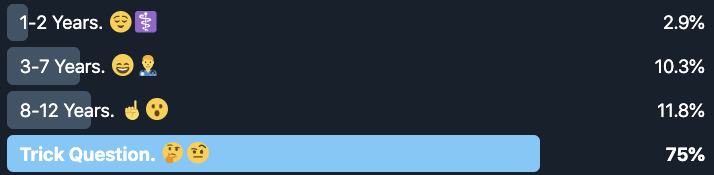 75% of my followers got the right answer -- Doctors indeed live shorter lives than average. By 3 years! We need to make things much less stressful and better for doctors, but also I think that we need to stop acting like doctors know everything - they are experts from the past... https://twitter.com/DanielleFong/status/1262726164721709056 …pic.twitter.com/cl0EQOMw8q