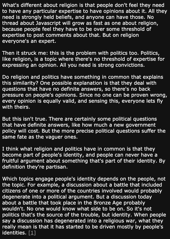 Keep your identity small (2009) From Paul Graham. @paulg I finally realized today why politics and religion yield such uniquely useless discussions. As a rule, any mention of religion on an online forum degenerates into a religious argument. Why? http://www.paulgraham.com/identity.html pic.twitter.com/XLUER5W6Ka