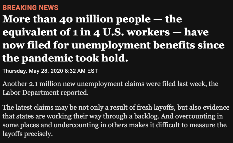More than 40 million people — the equivalent of 1 in 4 U.S. workers — have now filed for unemployment benefits since the pandemic took hold.pic.twitter.com/J5iItleuC7