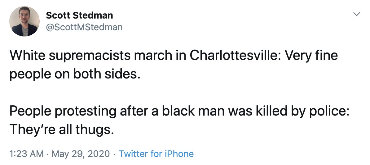President Trump's threatening tweet about Minneapolis was hidden by Twitter for "glorifying violence." He is also facing condemnation for calling protesters "thugs," many comparing the tweet to his description of Charlottesville white supremacist marchers as "very fine people":pic.twitter.com/4zoLuIyOuP