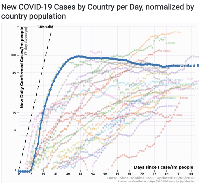 This graph gives COVID-19 cases normalized by country population. Chile, Peru, Brazil Sweden, United States, Russia, Sweden, Bolivia, Iran, Ecuador, Mexico, these jump out a bit. Now Iraq too, from a low start.pic.twitter.com/62smGpNKMK