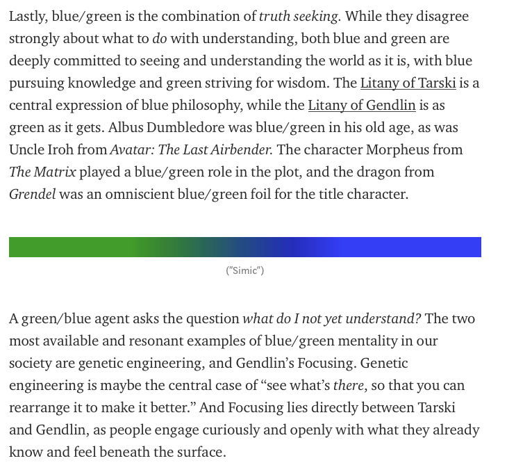 "But they’re different. If you’re blue/green and you walk around implicitly believing that everyone else is, too, you’re going to be confused and disappointed at how everyone is just regularly screwing up, and how they don’t even notice it." https://humanparts.medium.com/the-mtg-color-wheel-c9700a7cf36d …pic.twitter.com/manyYdnt8S