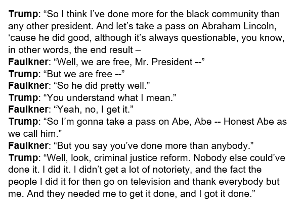 Here's the transcript of Trump's remarks on how Abraham Lincoln "did good, although it's always questionable, you know, in other words, the end result..." pic.twitter.com/HhvlDqlYCU
