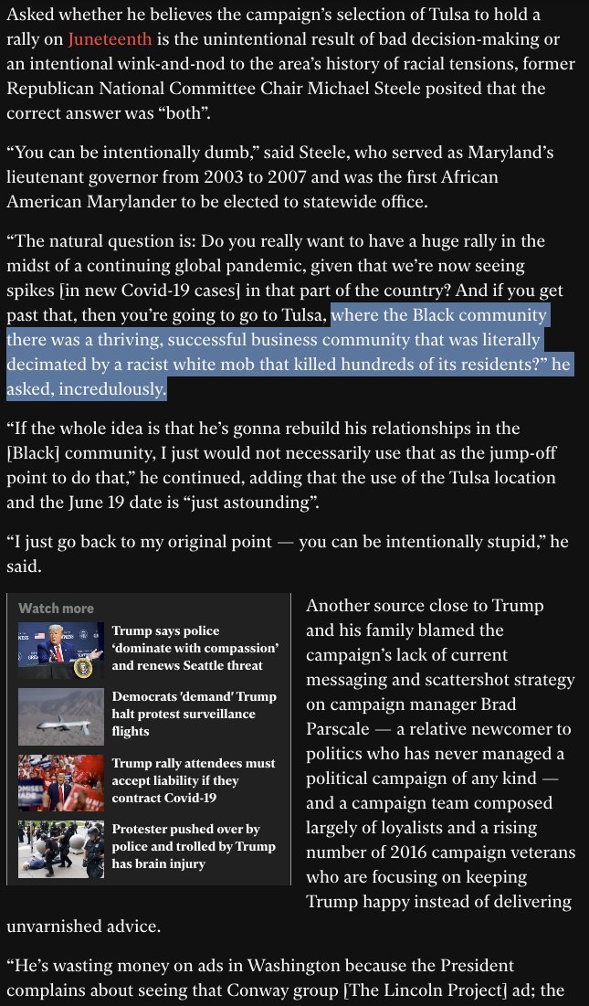 "if you get past [the virus], then you’re going to go to Tulsa, where the Black community there was a thriving, successful business community that was literally decimated by a racist white mob that killed hundreds of its residents?” he asked, incredulously https://www.independent.co.uk/voices/trump-campaign-insiders-rally-juneteenth-coronavirus-biden-a9563626.html …pic.twitter.com/8EzdZ3gBzV