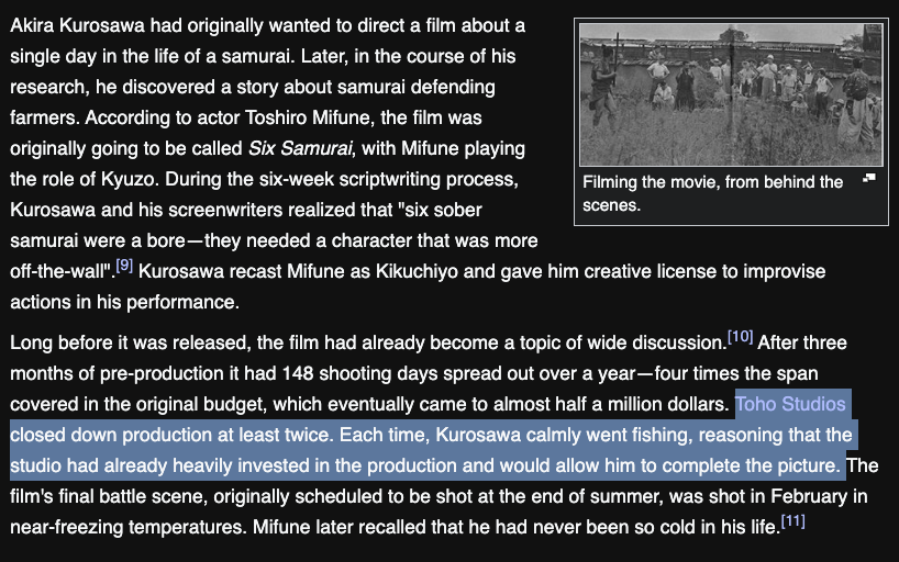 "Toho Studios closed down production at least twice. Each time, Kurosawa calmly went fishing, reasoning that the studio had already heavily invested in the production and would allow him to complete the picture." https://en.wikipedia.org/wiki/Seven_Samurai …pic.twitter.com/gJHXMHK85T