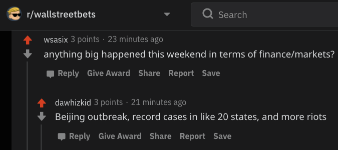 "anything big happened this weekend in terms of finance/markets?" [wsasix] "Beijing Outbreak, record cases ☝️🏻😮 in like 20 states, and more riots" [dawhizkid] 🧑🏻‍💻pic.twitter.com/Dt0SpjblcC