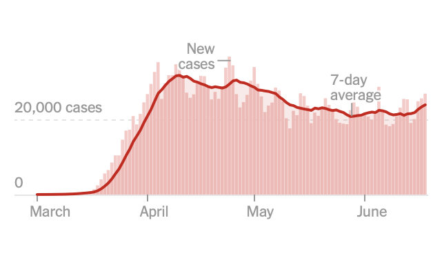 Hard to be sure and hope to be wrong, but especially with the state-by-state graphs, seems likely we are just a few weeks away from daily record cases :( (US daily new cases, from https://www.nytimes.com/interactive/2020/us/coronavirus-us-cases.html …)pic.twitter.com/DxMquxL90u