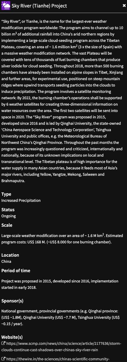 Large-scale weather modification over an area of ~ 1.6 M km2. Estimated program costs: US$ 168 M. (~US$ 8.000 for one burning chamber)