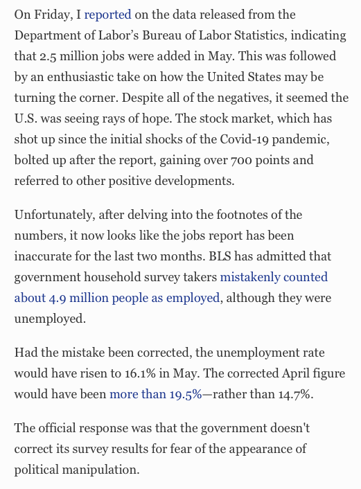 do you not know about this? https://www.forbes.com/sites/jackkelly/2020/06/08/theres-a-glaring-misleading-error-in-the-may-jobs-report-us-may-be-at-20-unemployment/#705bd52a60d3 …pic.twitter.com/Dxg4wDkLYU