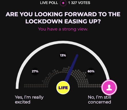 Live poll on http://Huffingtonpost.co.uk on whether or to we're excited about the lockdown easing up. It is a continuous distibution of choices (neat UI) and shows biomodal answers! I want to be able to avoid people from the other side lol.pic.twitter.com/NKgjrdidiu