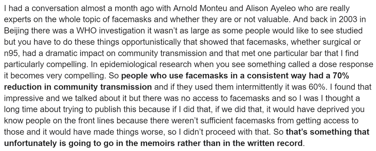 I just found this very concerning podcast with epidemiologist Ian Lipkin, former WHO adviser on SARS, who said that he chose *not* to release information that masks were strongly protective against SARS, in order to protect supply.
