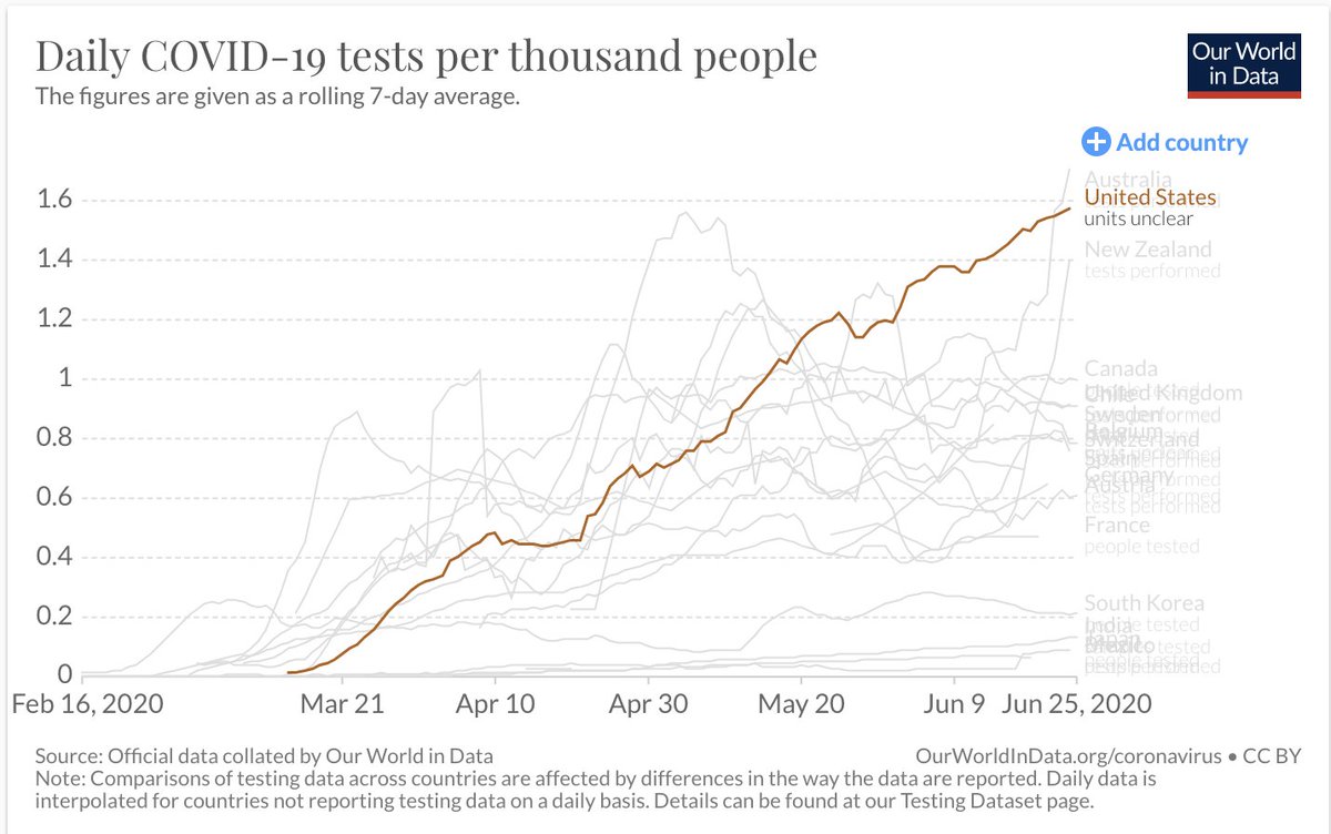 The US COVID19 testing rate is very high compared to other large countries. With yesterday's reported 640K COV2 tests, its 7-day avg will move even higher. H/T @daniellevitt22pic.twitter.com/giLXprTgCa