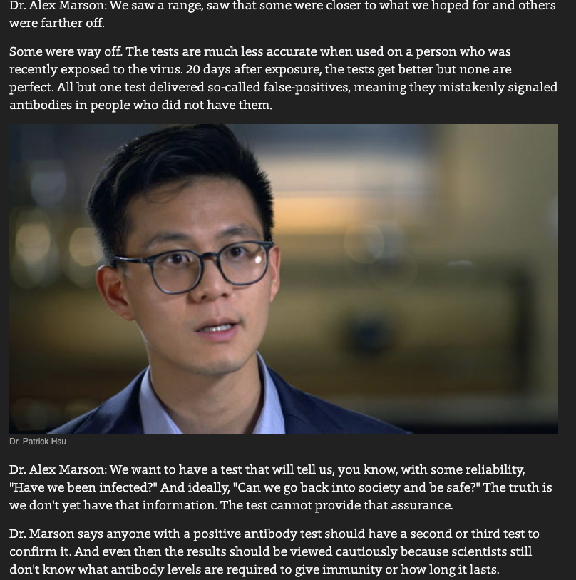 Dr. Alex Marson: We want to have a test that will tell us, you know, with some reliability, "Have we been infected?" ideally, "Can we go back into society & be safe?" The truth is we don't yet have that information. The test cannot provide that assurance. https://www.cbsnews.com/news/coronavirus-antibody-testing-inaccurate-data-60-minutes-2020-06-28/ …pic.twitter.com/AkmXZXSgTt