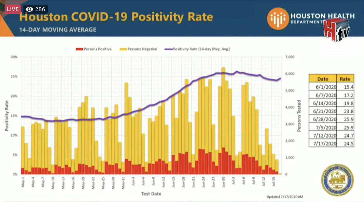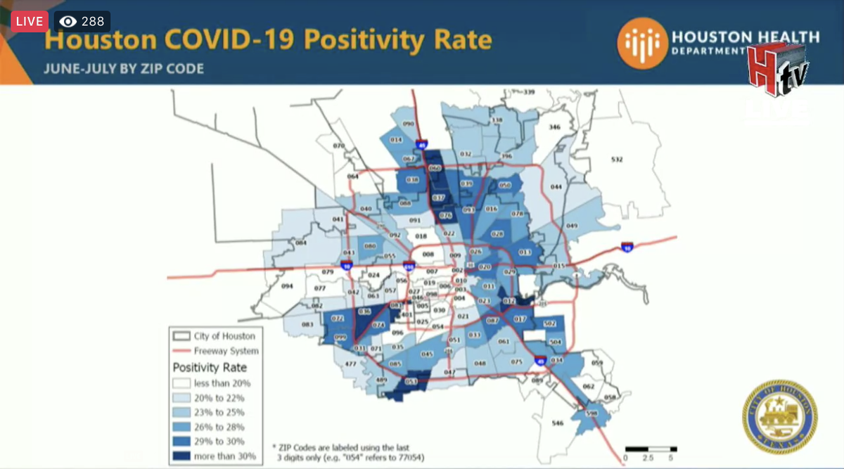 Per Houston public health authority @DPersse, the rate of #COVID19 tests coming back positive in the city has slightly dipped from a high of 25.9% to 24.5% as of Friday. Some zip codes are still seeing rates above 30%. #hounews pic.twitter.com/5u0wExZ16o