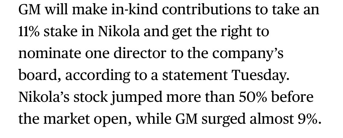 RE: GM “investing” in Nikola Motors, this is what’s happening. GM is investing “in kind” and $NKLA is selling shares in itself, will pay GM for batteries and fuel cells