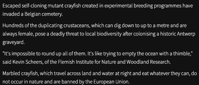 https://www.nzherald.co.nz/world/escaped-cloned-female-mutant-crayfish-take-over-belgian-cemetery/YZDGK4GTJKKML7Y76OELOTHGPA/ …