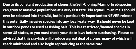 You can buy these self cloning things for $8. Literally no way hubris does not end up being humanities downfall, but I had my money on AI as the reason, not craw daddies. https://aquaticarts.com/products/self-cloning-marmorkreb-crayfish-juveniles …