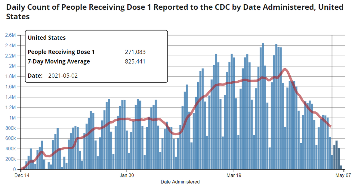 Maybe instead of trying to heroically interpret ambiguous survey data, we should look directly at the variable of interest: how many people are getting vaccinated. It underwent a huge nonlinear plunge timed *exactly* to the J&J pause and has never recovered (see below). https://twitter.com/davidlazer/status/1390768934421516298 …pic.twitter.com/pC7OhdVq1h