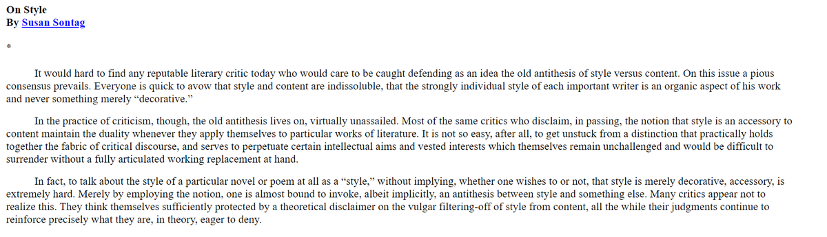 Susan Sontag's "On Style": http://www.coldbacon.com/writing/sontag-onstyle.html … I've wondered about the analogous thing in science. Beauty may seem a mere nice-to-have in our explanatory theories, but in fact seems so important as to be almost a fundamental element of reality.pic.twitter.com/fzTneZKSga