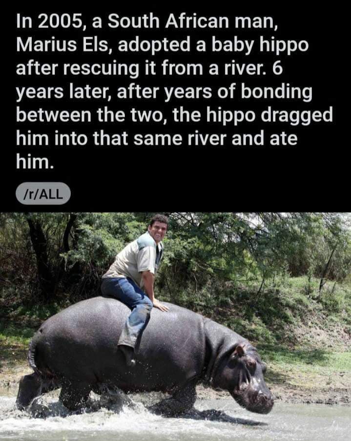 Humans have tried to domesticate thousands of wild animals since pre-history, succeeded with only a handful. Don’t ever keep a wild animal as a pet. Here, this guy was torn & killed, not eaten. Hippos are mostly plant-eaters https://www.theguardian.com/world/2011/nov/14/pet-hippo-humphrey-kills-owner …pic.twitter.com/nOlReZ605H