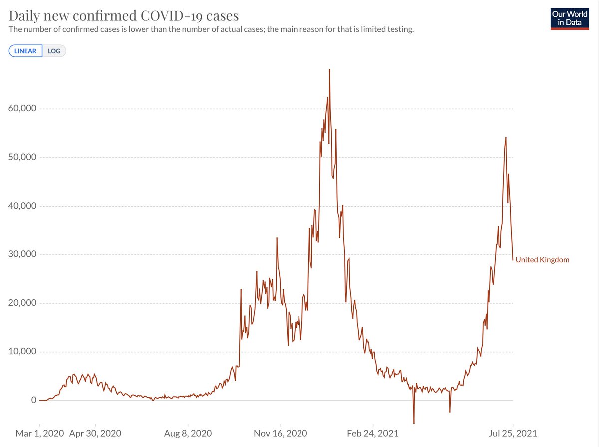 one (random) hypothesis is that the relatively better weather cooked the virus; this one should be quick to invalidate — by next week! another is that delta’s virus spam rapidly reaches many vulnerable people but just as rapidly runs out of people who don’t have partial immunitypic.twitter.com/TxUQ9p9HOt