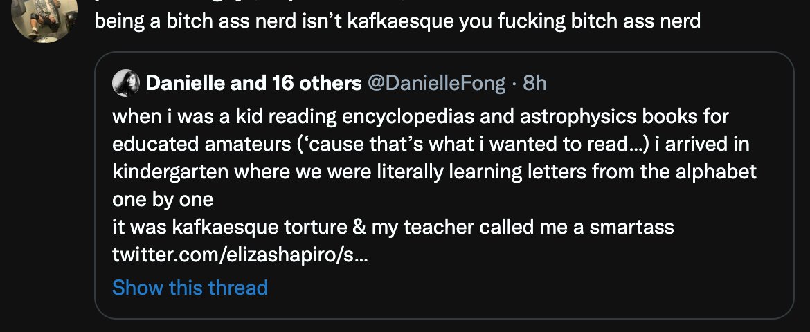when i was a kid reading encyclopedias and astrophysics books for educated amateurs (‘cause that’s what i wanted to read…) i arrived in kindergarten where we were literally learning letters from the alphabet one by one it was kafkaesque torture & my teacher called me a smartasshttps://twitter.com/elizashapiro/status/1446435627495530496 …