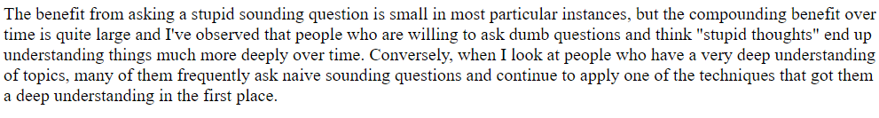 at lightsail, we made thursday “stupid question day”, wherein you were not only encouraged but obligated to ask your stupid questions. we paid for lunch for everybody. it was a great thing