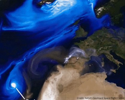 Visualization of Ophelia picking up smoke & dust, which created the hazy red sky in UK (http://bbc.in/2mqkmXA ). Excerpt/crop of must-see vid from @NASAGoddard (h/t @gdimeweather) of whole peak of #hurricane season: https://go.nasa.gov/2mtxxqG  pic.twitter.com/WaXXoKWx5j