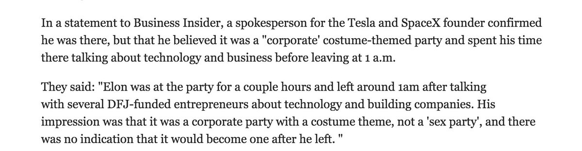 Tesla spokesperson confirms that Elon Musk attended a sex party, but thought it was a "a corporate party with a costume theme." http://www.businessinsider.com/elon-musk-attended-notorious-silicon-valley-party-left-early-2018-1 … pic.twitter.com/YvkSyAPkch