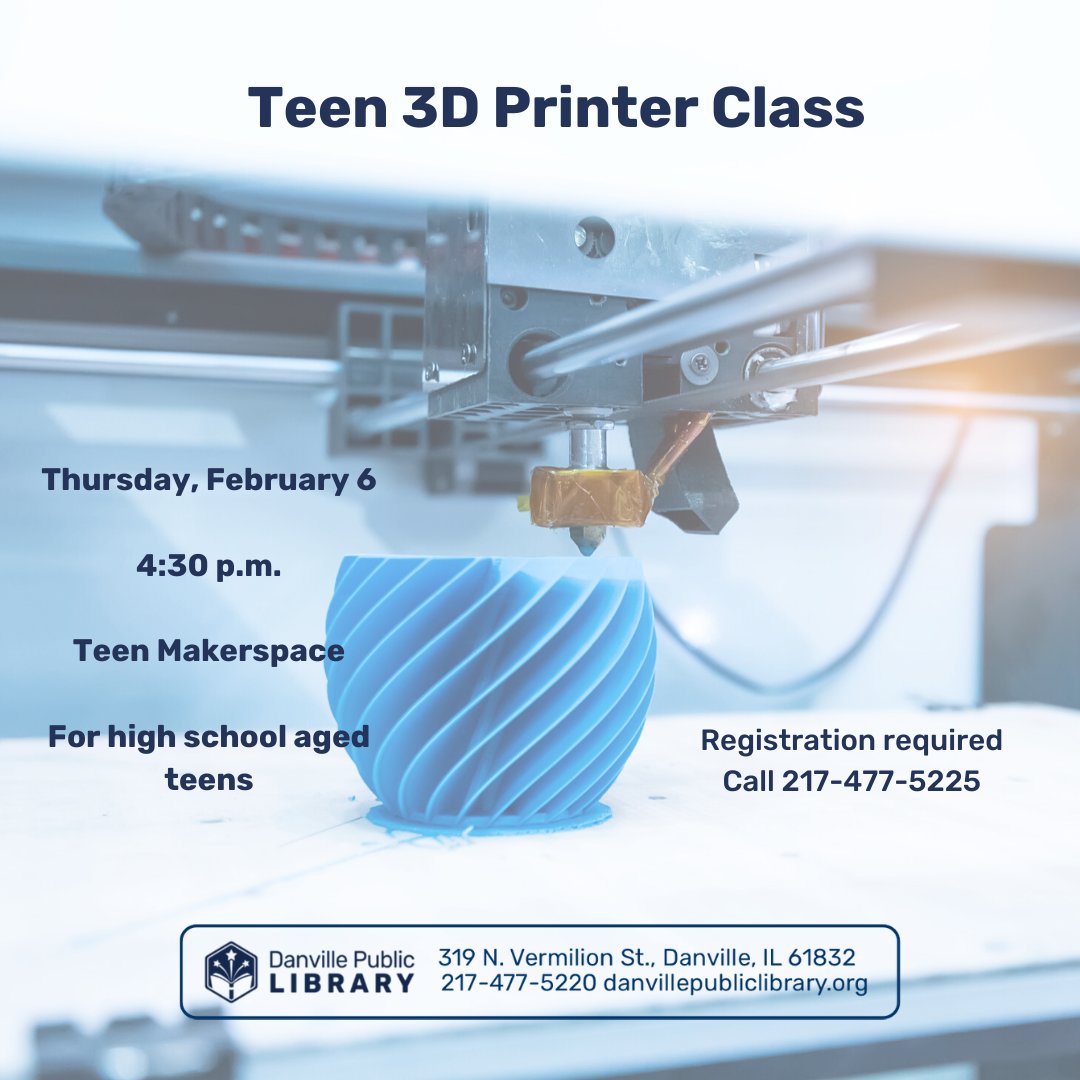 A Teen 3D Printer Class will be held at 4:30 p.m. in the Teen Makerspace on February 6. Registration is required; the class is limited to five participants. For high school aged teens.