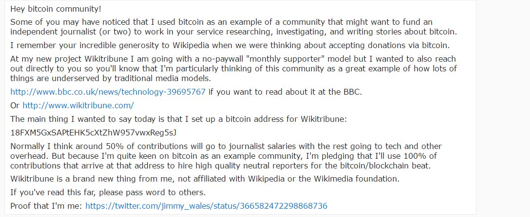 Wikipedia founder @jimmy_wales launches ad-free news site #WikiTribune & makes a pledge to the #bitcoin community.