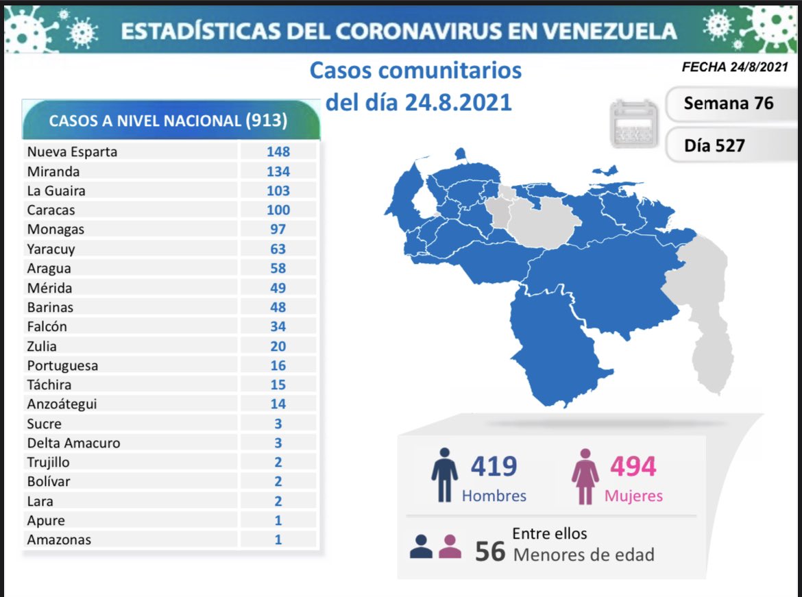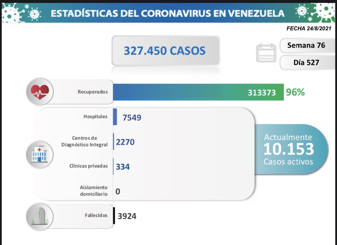 Reporte de la situación de COVID-19 en Venezuela, ofrecido el 24 de agosto por la vicepresidenta de la República, Delcy Rodríguez: 928 nuevos casos. 15 nuevas muertes. 10 153 casos activos. Total en 527 días: 327 450 casos. 313 373 recuperados. 3924 fallecidos.pic.twitter.com/Y8qw7cVEqK