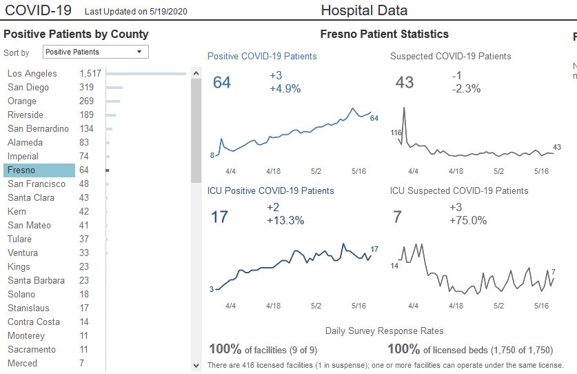 166 people have been hospitalized in Fresno County, up 6 today. State hospital data shows 64 COVID-19 patients are in hospital now, plus 43 suspected patients. The 107 total is up 2. 17 are in ICU, plus 7 suspected patients. The 24 total is up five from yesterday.pic.twitter.com/DMqnhAL9FP