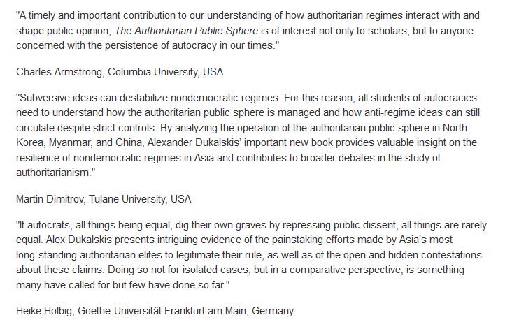 #book - The Authoritarian Public Sphere - is now published. See reviews below and more details here: https://www.routledge.com/The-Authoritarian-Public-Sphere-Legitimation-and-Autocratic-Power-in-North/Dukalskis/p/book/9781138210356 …pic.twitter.com/tsZrEbK0sO