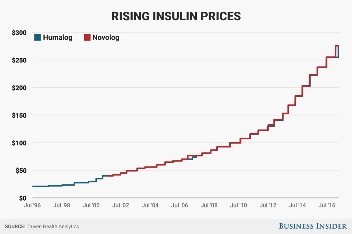 I can validate this. Diagnosed with T1D in 1989 -a bottle of insulin was $14. The last time I asked my pharmacy for the price without insurance (a cpl of months ago) it was $354.