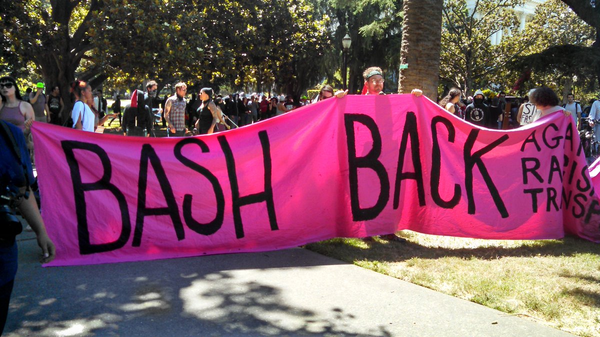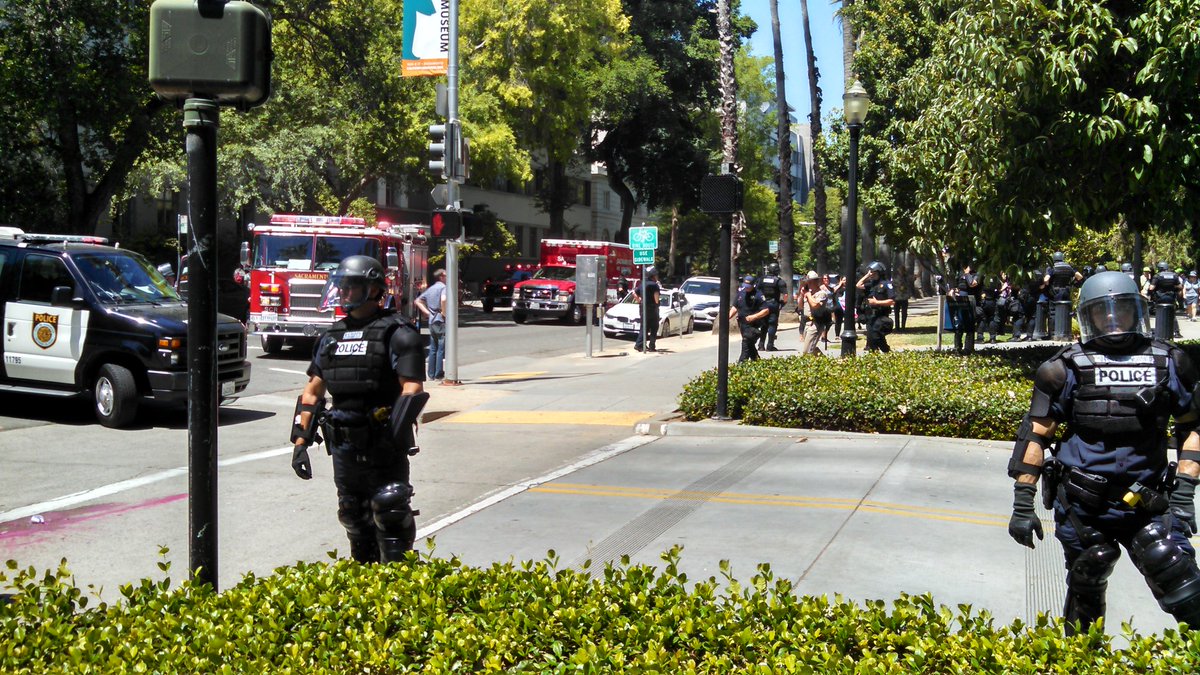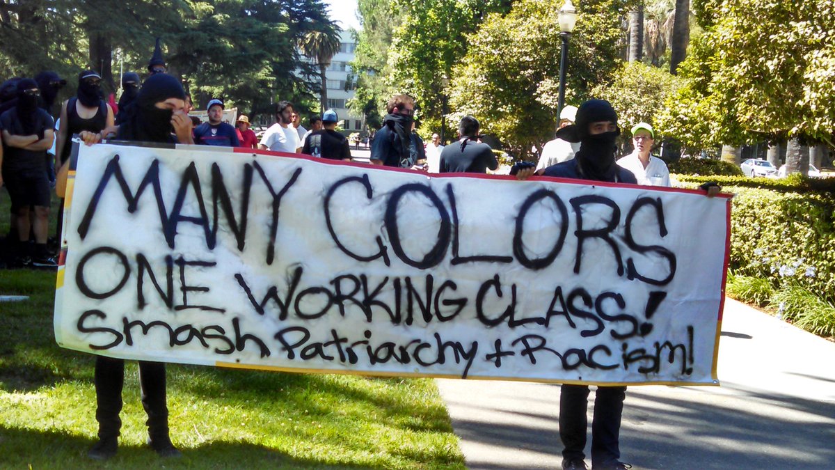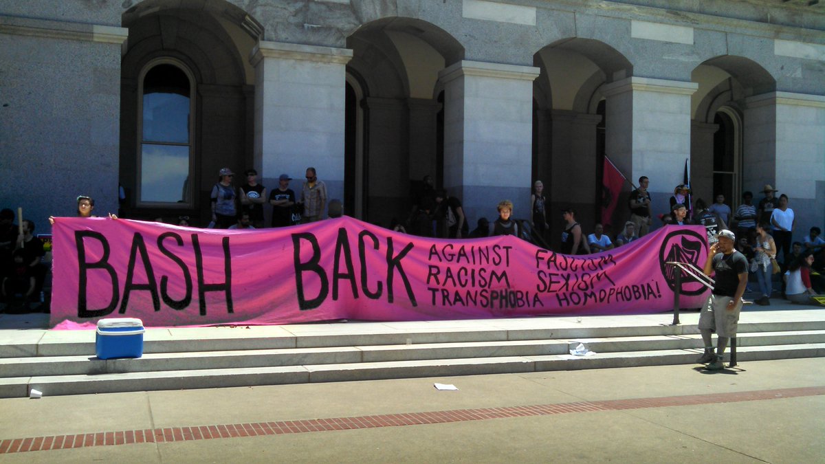 Hundreds chant, When nazi skinheads come to town, what do we do, shut it down. #nonazisinsacpic.twitter.com/X04QBvcnod