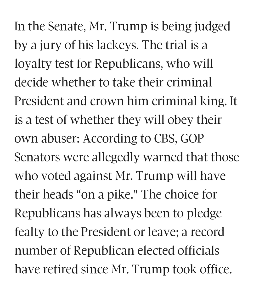 "In the Senate, Trump is being judged by a jury of his lackeys. The trial is a loyalty test for Republicans, who will decide whether to take their criminal president and crown him criminal king." https://www.theglobeandmail.com/opinion/article-americans-are-the-witnesses-to-democracys-demise/?utm_source=facebook.com&utm_medium=Referrer%3A+Social+Network+%2F+Media&utm_campaign=Shared+Web+Article+Links …pic.twitter.com/3Mk2uwNorf