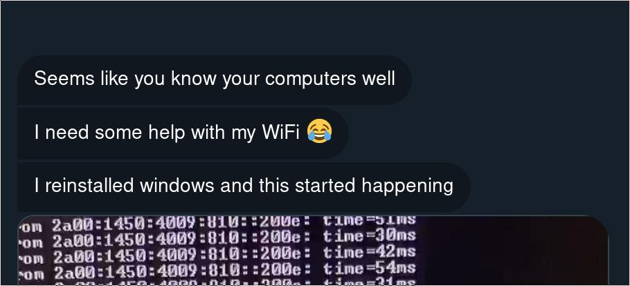 Some people get unsolicited DMs asking them to hack stuff. Apparently I get people asking me to fix their WiFi ???pic.twitter.com/SYqQZU9J03
