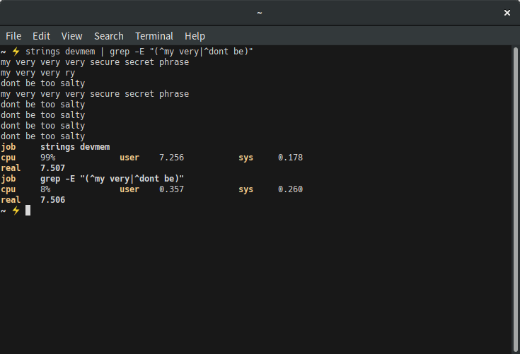no, it's just a RAM dump using a small buffer in the device's kernel memory. the actual grep occurs on my laptop.