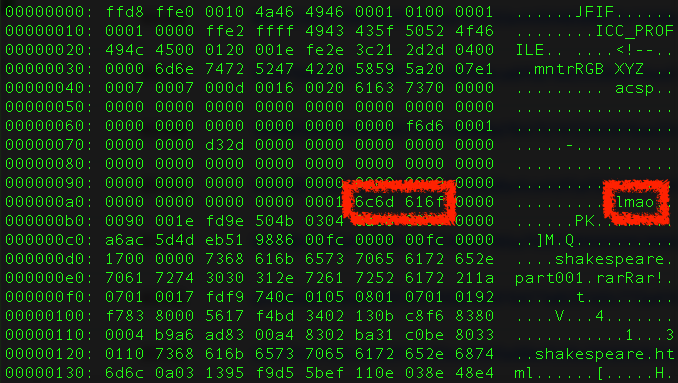 Assuming this all works out, the image in this tweet is also a valid ZIP archive, containing a multipart RAR archive, containing the complete works of Shakespeare. This technique also survives twitter's thumbnailer :Ppic.twitter.com/P0Owq9abRC