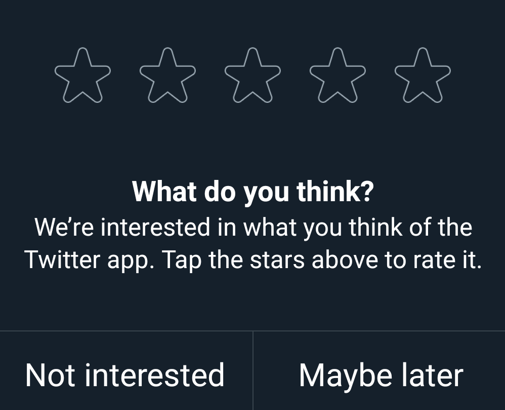 Twitter only prompts satisfied users to leave a Play Store review 🤔 Surprised this pattern doesn't violate Play Store ToS...pic.twitter.com/VCUiyje1LI