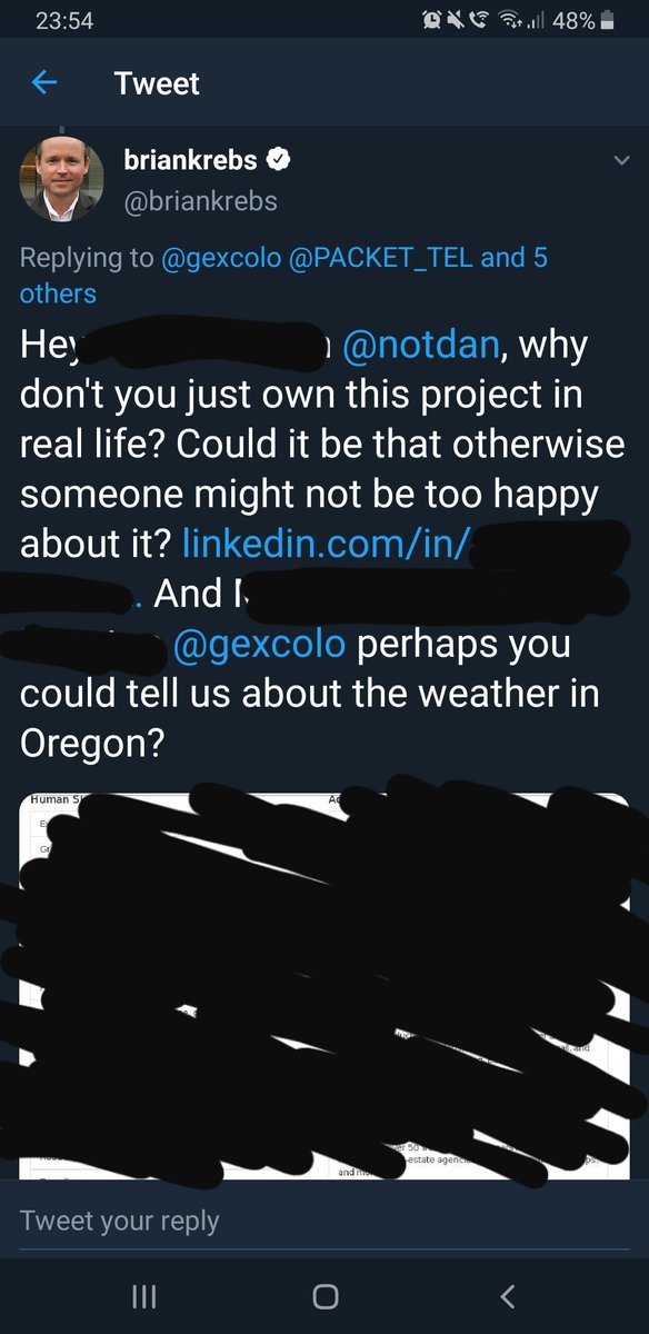 In which Krebs spends six consecutive hours of his time doxxing @notdan and @gexcolo because he doesn't like that they provide evidence that Spamhaus automatically blacklists port scanners... Screenshot for posterity. Censored for privacy just in case the original is deleted.pic.twitter.com/WoOU0dx1qk