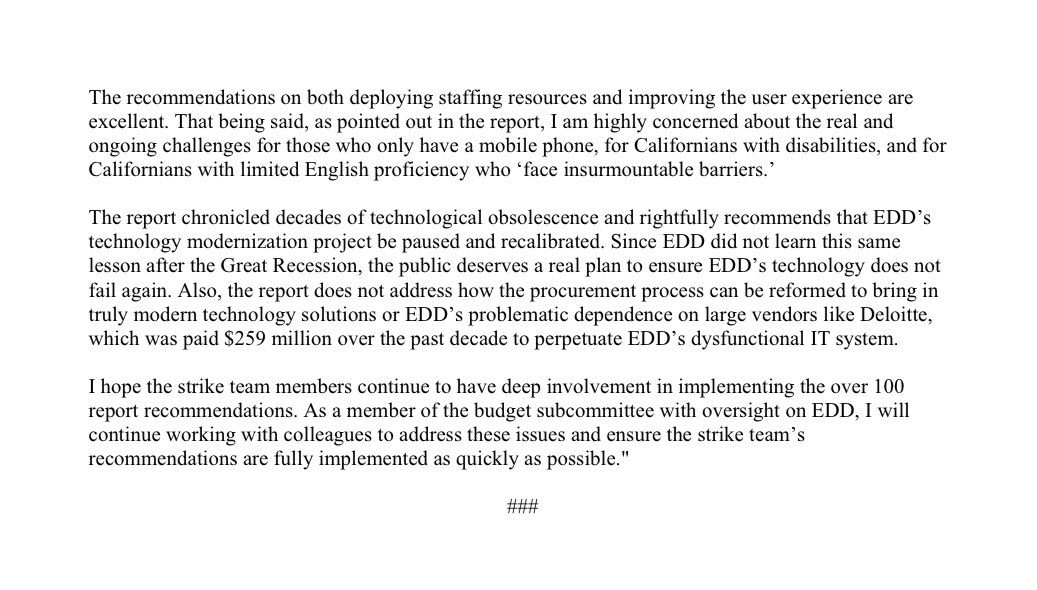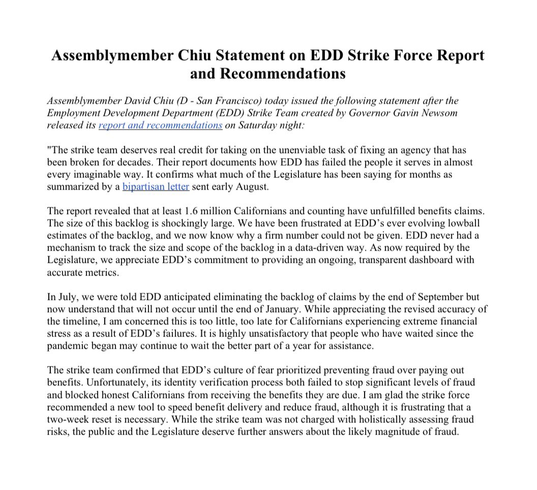 This weekend, the EDD strike team released their report & recommendations for reforming EDD. As the report makes clear, there is tremendous work ahead. Please read my full statement:pic.twitter.com/vz7pjBovXj