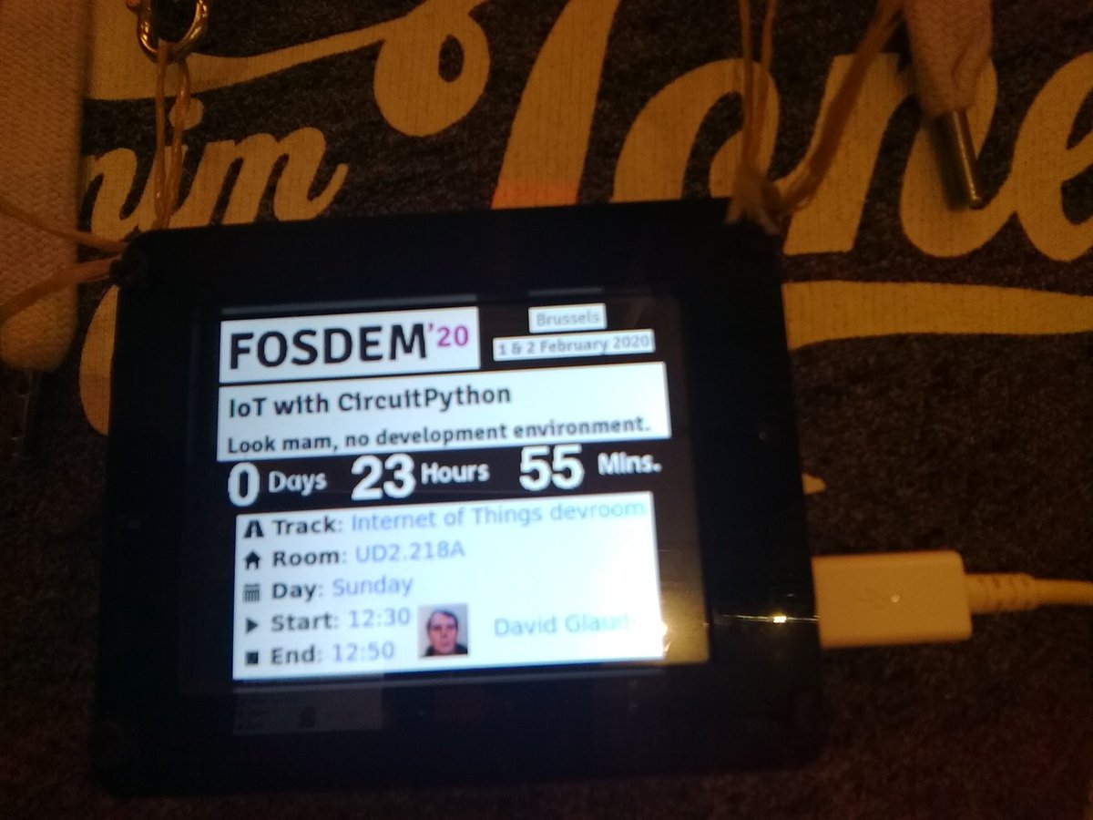 Now my PyPortal is a wearable badge and the code is available: https://github.com/dglaude/Fosdem20CircuitPython … See you tomorrow at