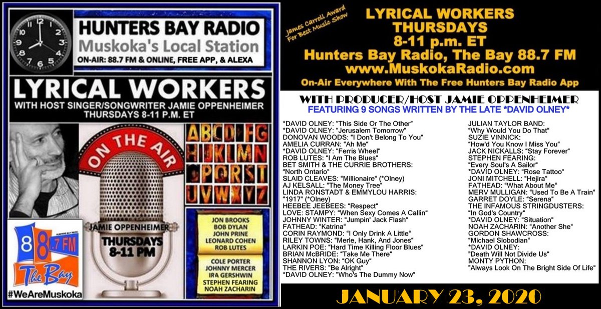 @DavidOlney Tribute: The 253rd Playlist for the award-winning LYRICAL WORKERS which airs Thursdays 8-11p w/ Host@SongsByJamieOpp on MUSKOKA'S LOCAL STATION http://MuskokaRadio.com/show/lyricalworkers …#WeAreMuskoka#MusicYouNeedToHear#LyricalWorkers#GotLocal?JamieOppenheimerSongwriter@gmail.compic.twitter.com/0sUBWN1nVi