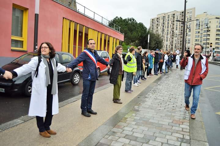 @CollectInterHop // chaine humaine de 700 personnes (hospitaliers, parents et enfants, citoyens, élus) autour de l'hôpital pediatrique Robert Debré#Paris19#EnsembleSauvonslHopital