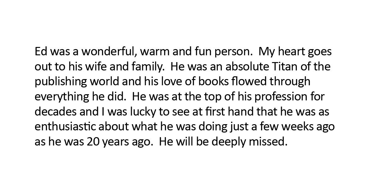 Such very sad news today that my friend, Ed Victor, has passed away. My thoughts are with Carol & Ed’s family. He will be missed by so many.pic.twitter.com/KBHpEO1S0N