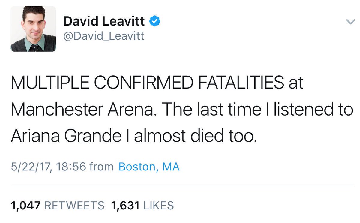 You clearly were impacted by the Boston Bombing https://twitter.com/David_Leavitt/status/327462553435398145 … so have some heart, care for those in Manchester