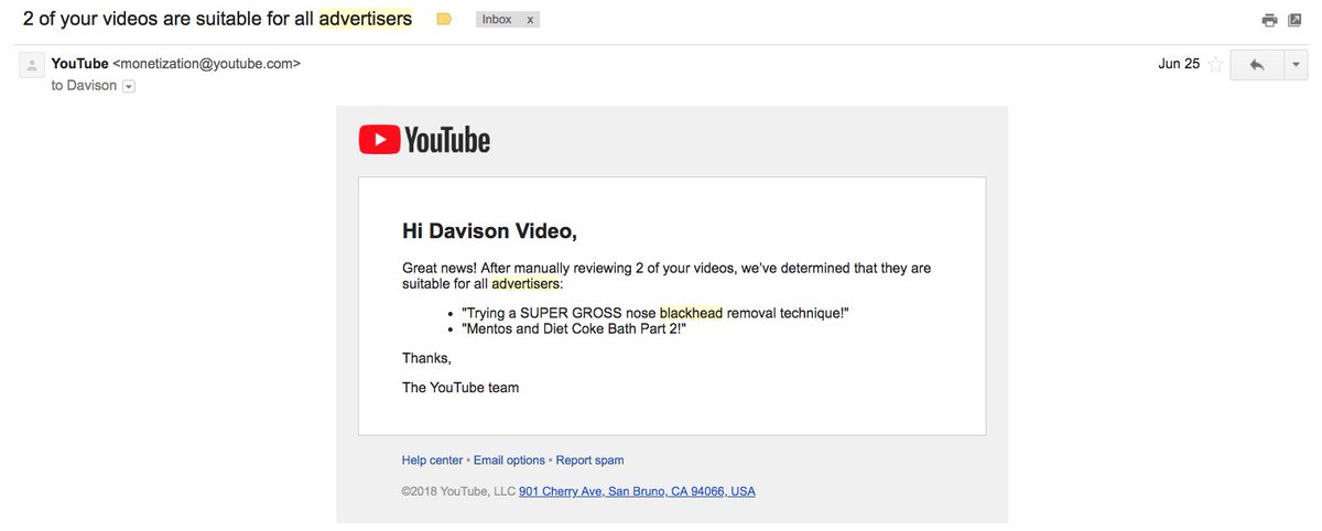 Twice I had this video approved for monetization via review (I don't know why it was done twice, but ok) and now it says "confirmed as not advertiser friendly by manual review" Can you please fix this @teamyoutube Your e-mail support does not resolve issue https://www.youtube.com/watch?v=kyluMm9xZRg …pic.twitter.com/eP2QEL1nEu